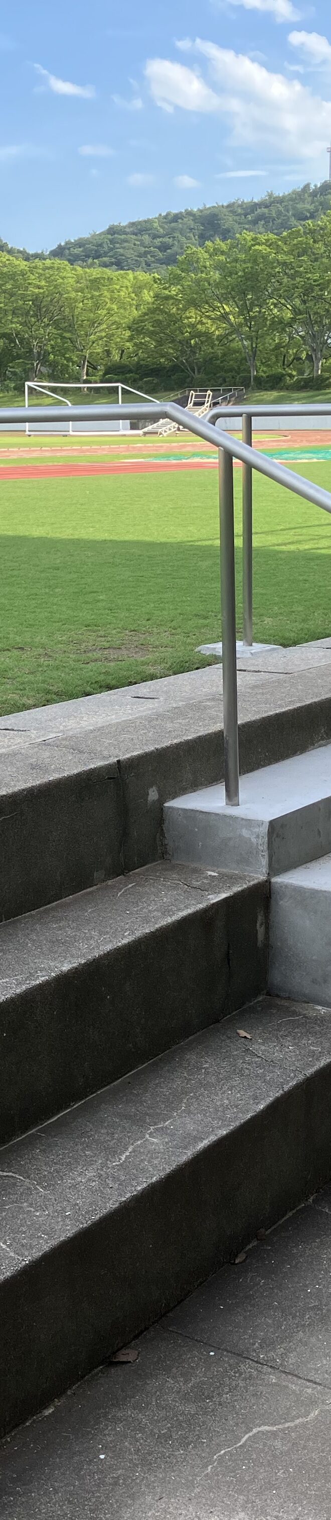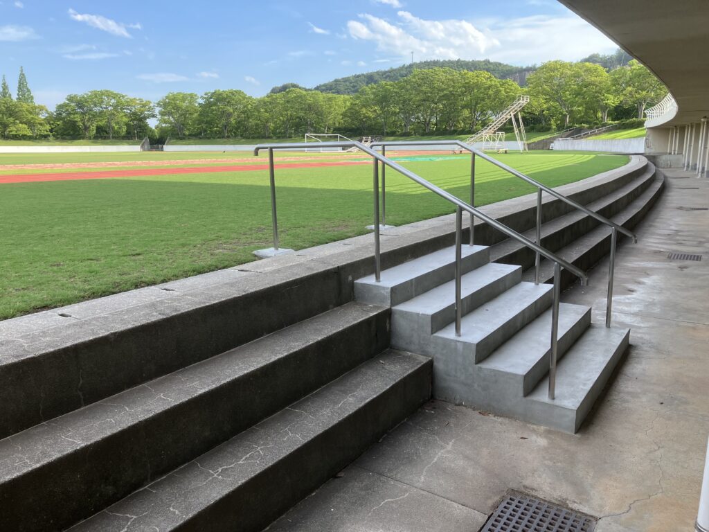 高砂市総合運動公園内の陸上競技場のフィールドに入る所に段差の低い階段を新たに設置しました(写真)。従来の階段は若者でも「高い」と感じる段差があり、ご高齢の方から「何とかして欲しい」との要望を受けで行政と折衝。半年余り時間を要しましたがこの様に設置されました。